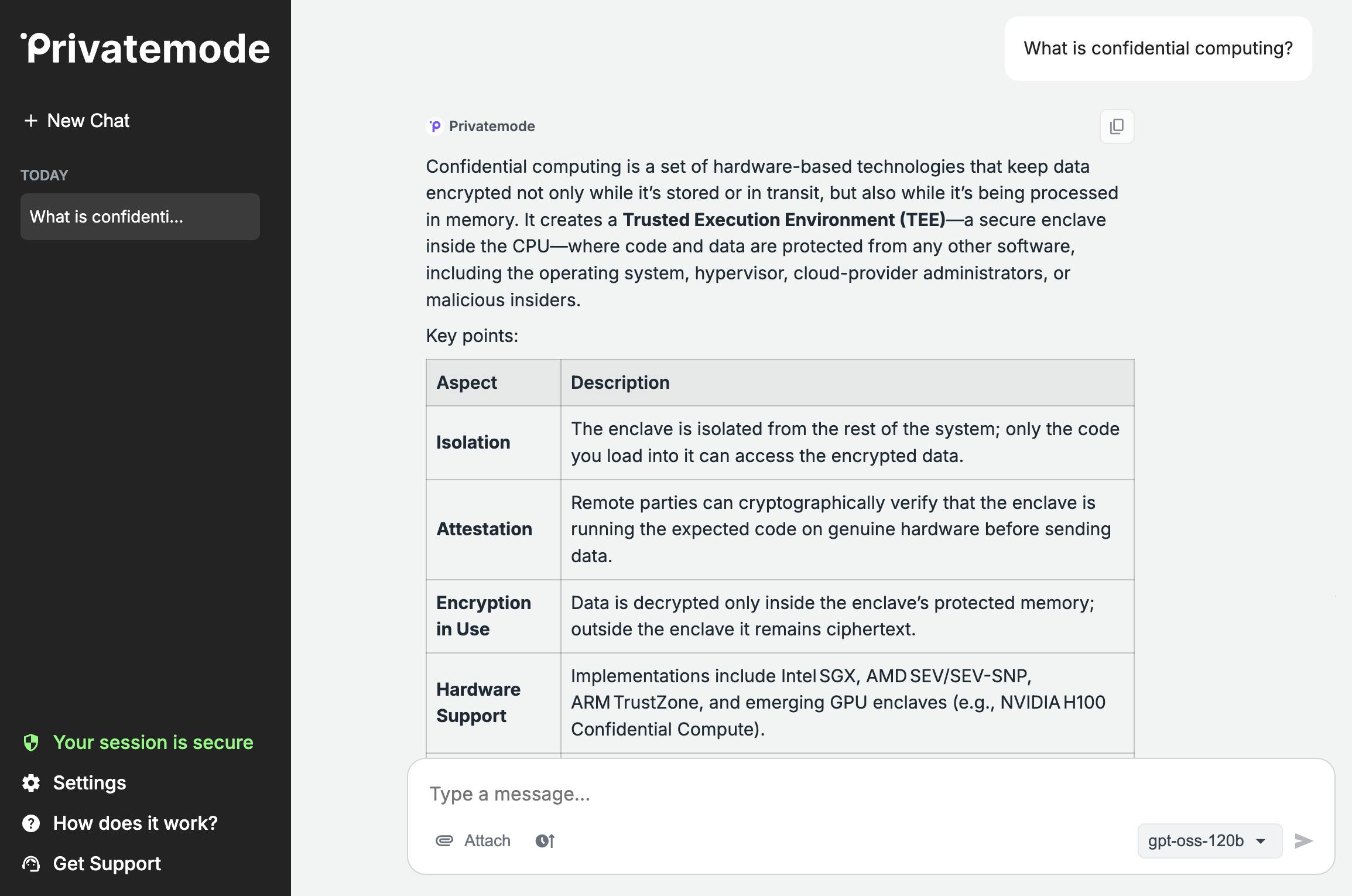 Privatemode lets you use the latest open-source AI models even with sensitive data. Privatemode’s architecture prevents the model from leaking your data and the infrastructure from accessing your data.